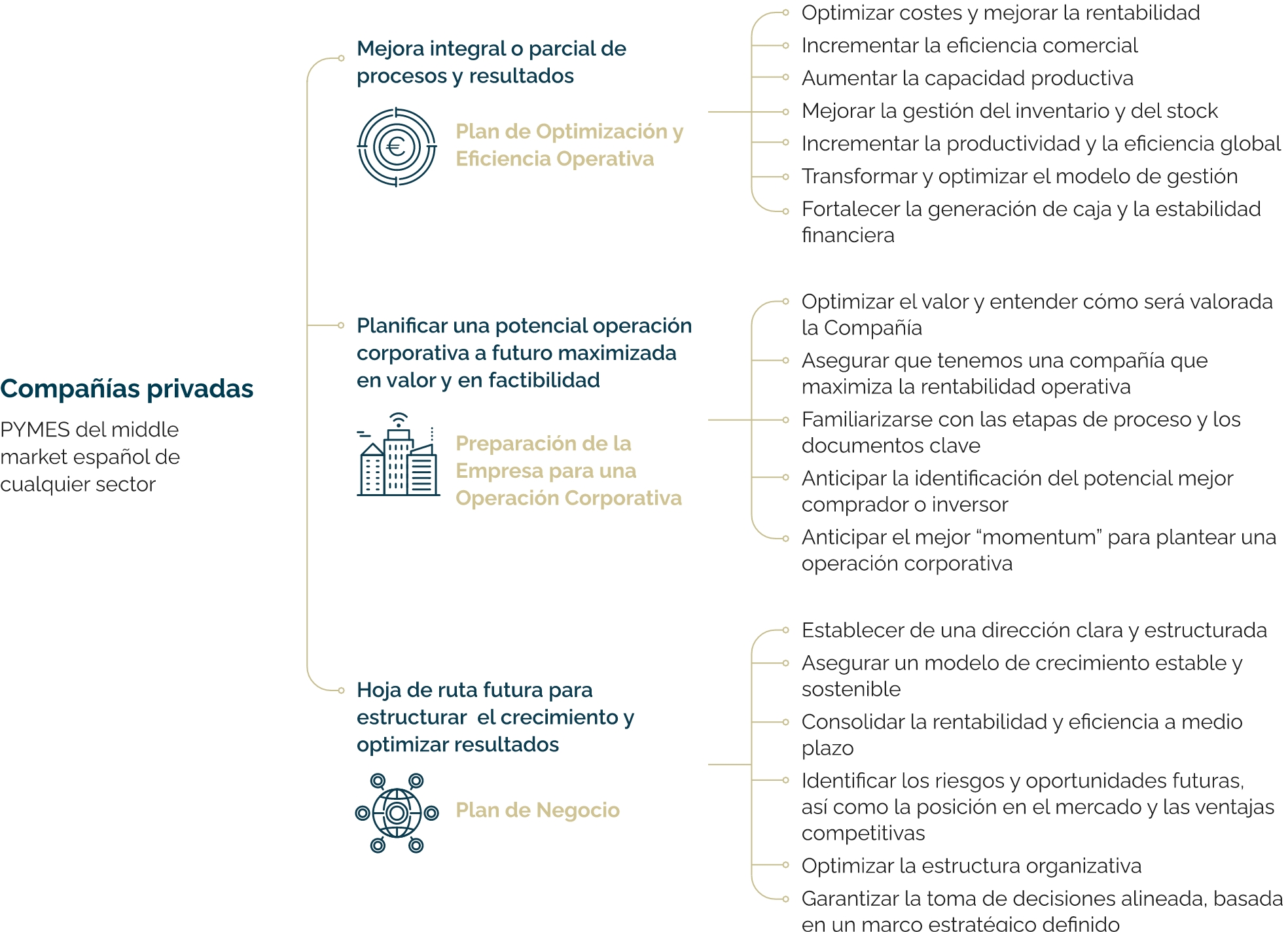 Aumentar el valor global de la empresa mediante la implementación de mejoras operativas que mejoran el EBITDA y generación de caja. Generar valor sostenible adicional actuando sobre procesos optimizados, personas y sistemas de información más fiables y precisos para la toma de decisiones.