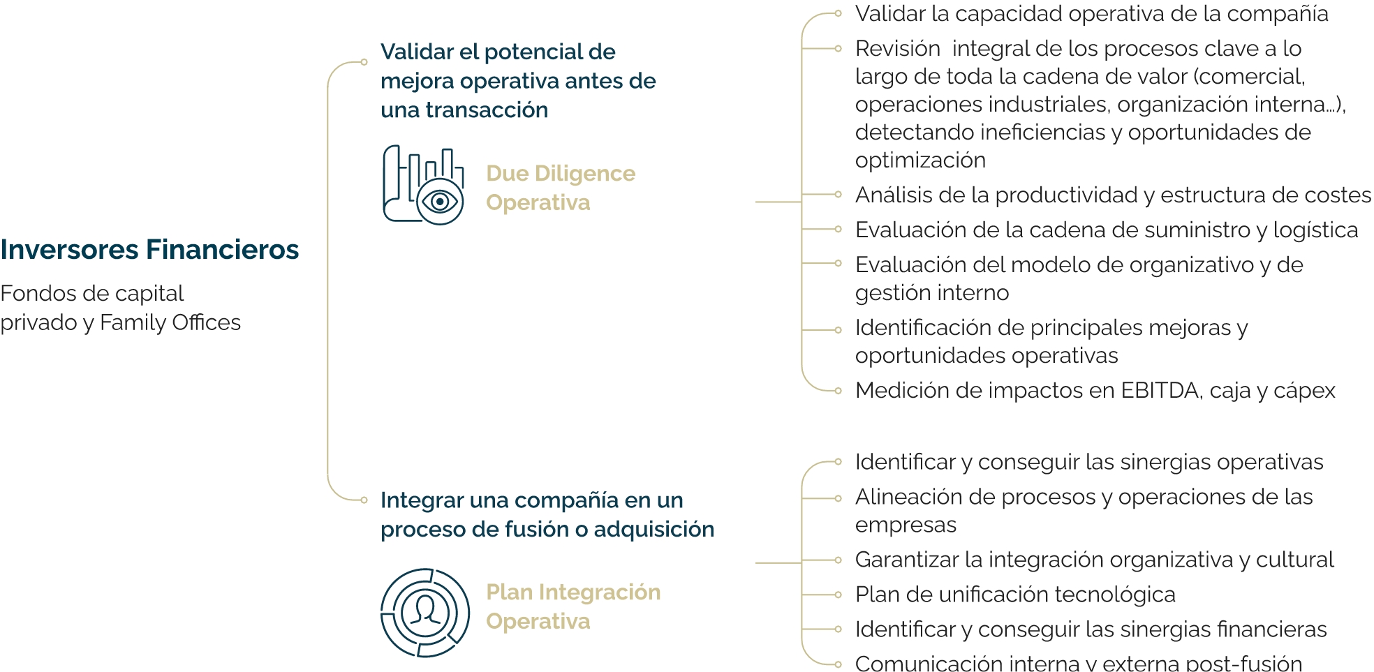 Cuando analizas una inversión, necesitas entender el potencial real más allá de los números. Realizamos due diligence operativas rigurosas e independientes, identificando palancas operativas concretas que pueden mejorar EBITDA y cash flow, validando si el valor que ves en el papel es realmente capturable.